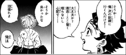 岩柱・悲鳴嶼行冥の柱稽古の訓練中に届けられたもので、その手紙を受け取って以来、善逸は口数が減り、いつもの騒がしい様子が見られない異様な状態になってしまいました。