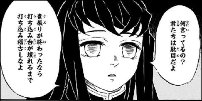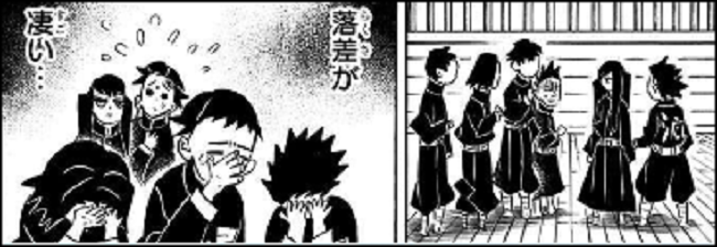 周りの鬼殺隊士は、そんな無一郎と炭治郎の打ち込み稽古を見て驚いています。(お口あんぐりw)