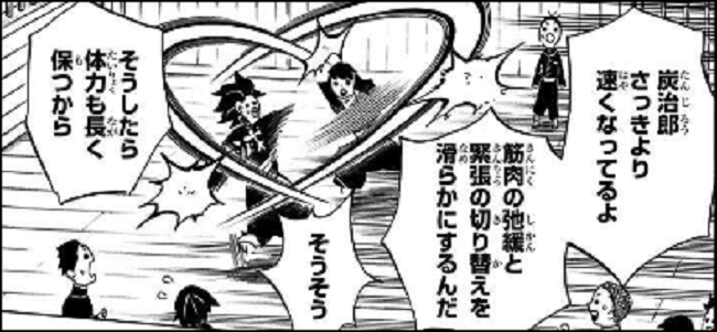 引用:鬼滅の刃15巻125話「迫る夜明け」善逸の「雷の呼吸」の足の使い方を教えてもらった炭治郎がその記憶を元に実践した結果、高速移動することができて半天狗を取り逃がさずに済みました。