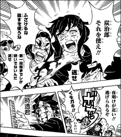 奪い取っていった「縁壱零式」の腕を壊し、刃こぼれした刀を炭治郎に向かって放り投げ「それ処分しといて」の一言。