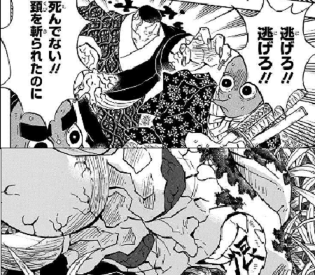 しかし喜びも束の間、頸を切ったはずの半天狗は自らの頭部を置き去りに走り続け、人間を襲おうとしています。実は炭治郎が切ったのは本体ではなく、これもまた分裂体だったのです。