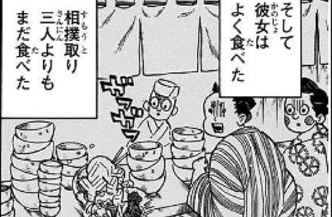 蜜璃は庶民的な食堂にも出入りして相撲取りにも負けない大食いを披露していました。(14巻123話)華族が庶民的な食堂に出入りするのか?というところに疑問が残ります。